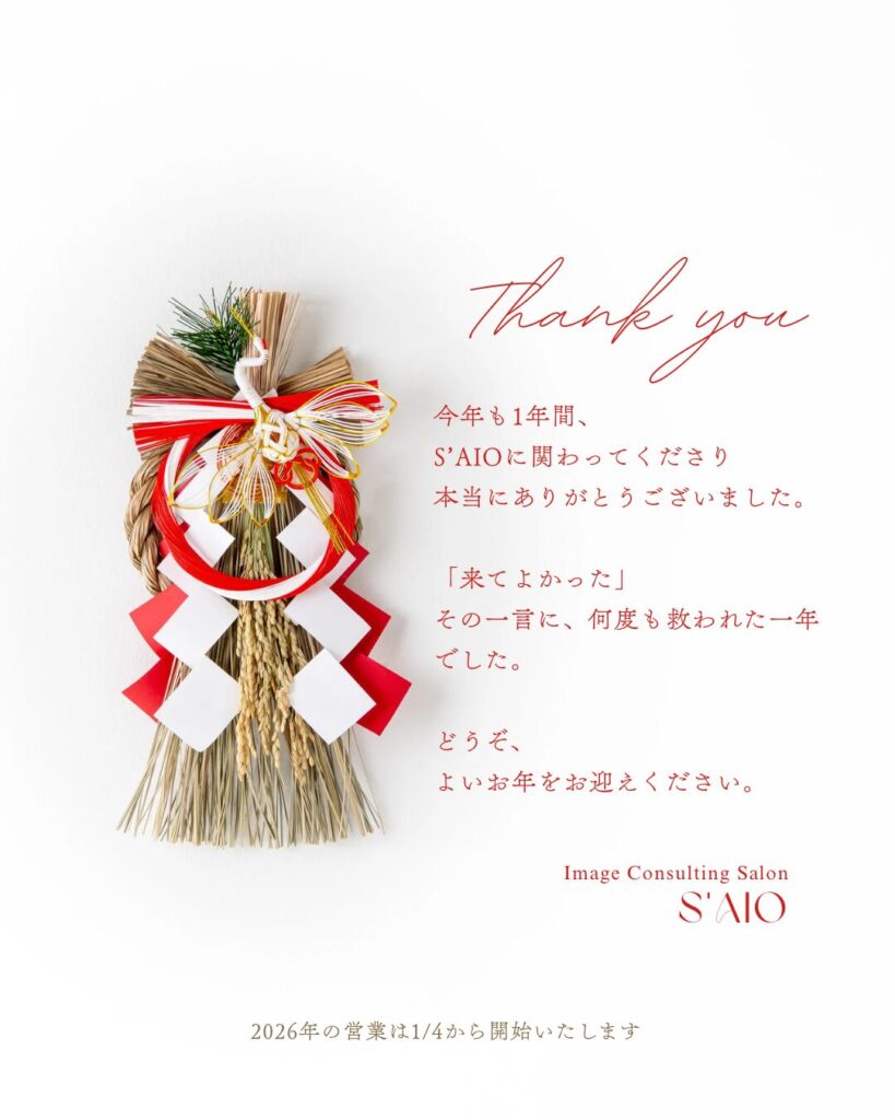 こんにちは。湘南のイメージコンサルティングサロン S’AIO(セオ)です。 今日から12月に入りましたね。イルミネーションや街のディスプレイもきらめき始め、ワクワクする季節になりました🎄 12月は人と会う機会が多く忙しくなる一方で、「年明けは落ち着... -